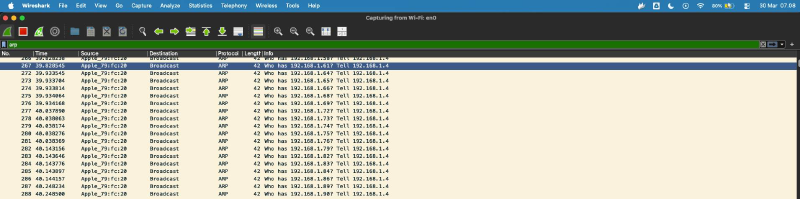nmap -PR -sn [target]Traffic yang digenerate oleh host ketika melakukan ARP scan, dicapture menggunakan Wireshark: